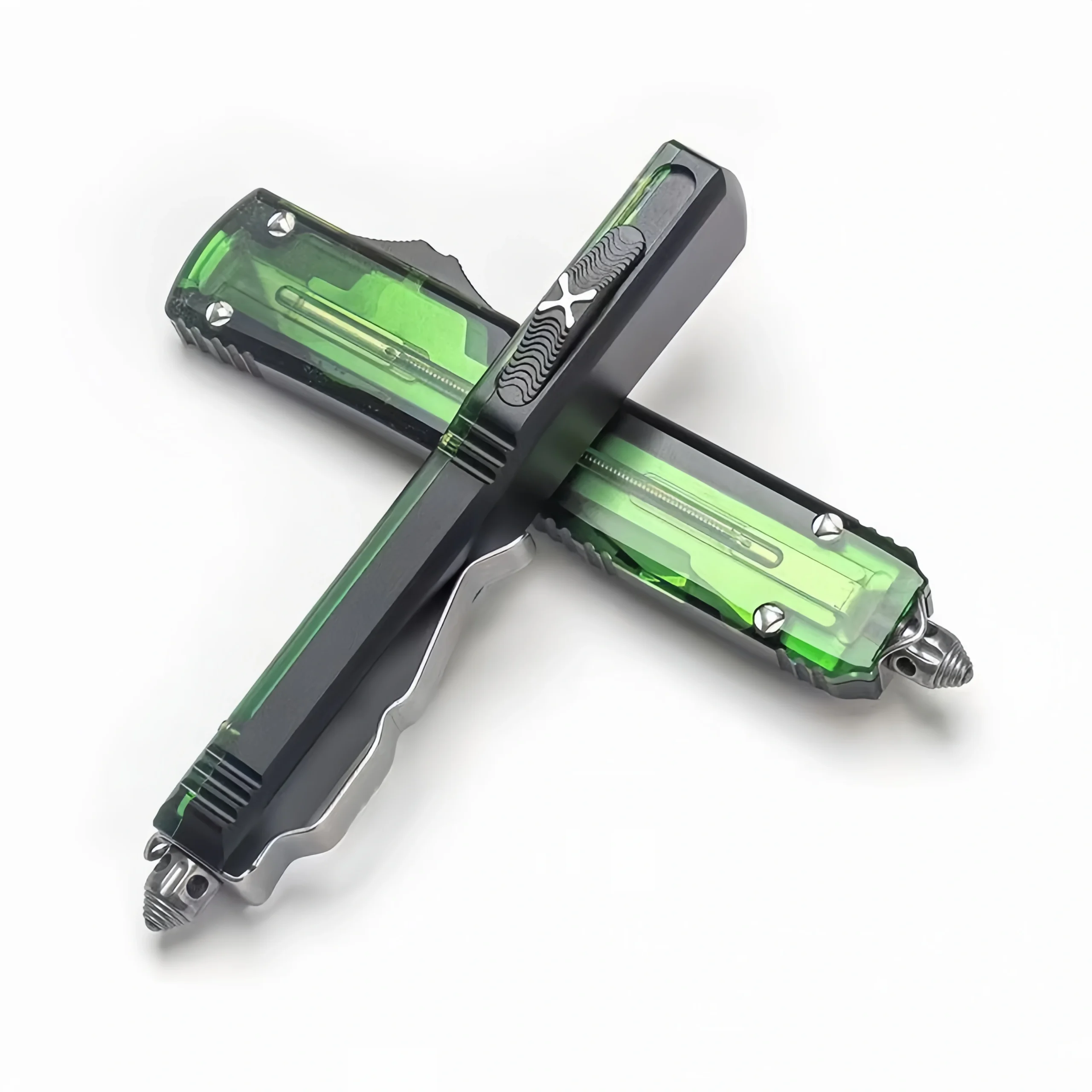OTF knife with green, transparent handle